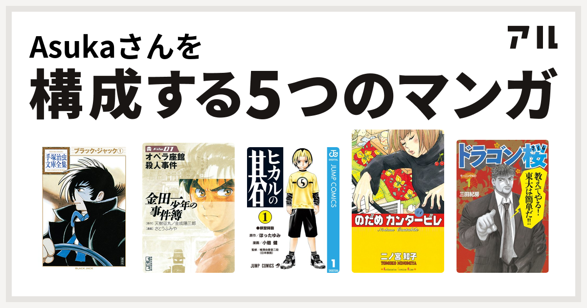 Asukaさんを構成するマンガはブラック ジャック 金田一少年の事件簿 ヒカルの碁 のだめカンタービレ ドラゴン桜 私を構成する5つのマンガ アル